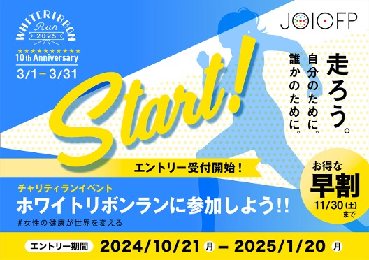 女性の健康が、世界を変える。ホワイトリボンランは、3月8日国際女性デーと連動させて、ジョイセフが2016年から発足したチャリティアクションです。ホワイトリボンが掲げる「すべての女性が健康で自分らしく生きられる世界」を目指し、ホワイトリボンの支援の輪を広げることを目的としています。 3/8 国際女性デーに向けて、「走ろう。自分のために。誰かのために。」というスローガンを掲げ、同じ公式Tシャツを着て世界の女性のためにみんなで走り、バーチャル(インターネット)でつながって世界中にホワイトリボンのムーブメントを起こします。 エントリー費の収益全額が寄付され、世界の女性の命と健康を守る活動に使われます。